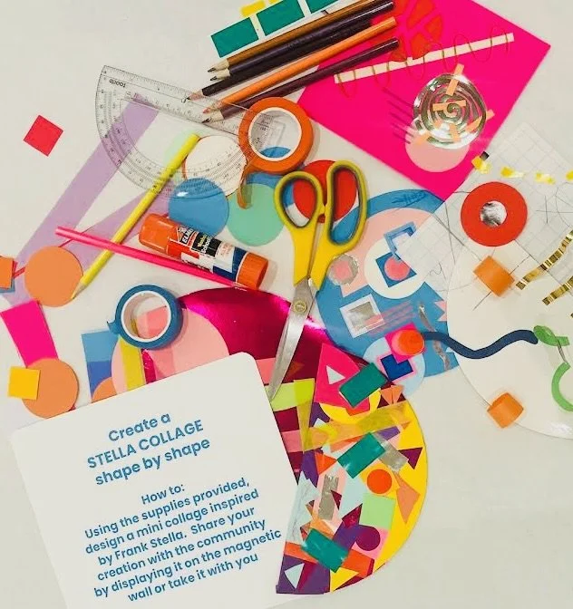 The current project is inspired by artist Frank Stella. His art is defined by the use of geometric forms, luminous color, and architectural composition. Pick an art-making station, then use supplies like colored pencils, colorful paper, and bright shapes to make your own Frank Stella collage. Then, when you’re finished, you can take your work home or hang it up to be on display in the museum.